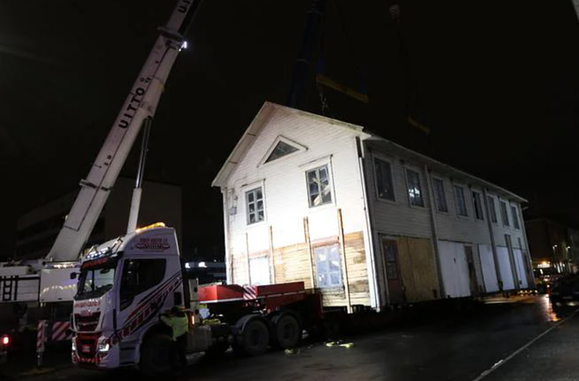 Rakennus siirrettiin pois torin laidalta, odottamaan oikeaa sijoituspaikkaa.